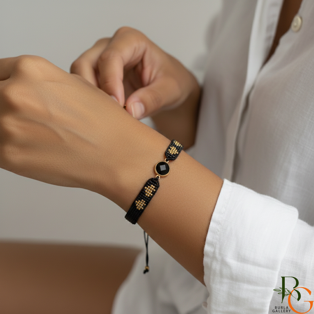 دستبند دو طرفه دست ساز میوکی اصل ژاپن 2 قلب با پلاک مشکی Miyuki